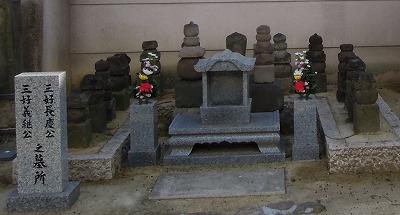 八尾市真観寺にある長慶と養子(甥)の義継の墓碑 2016.2