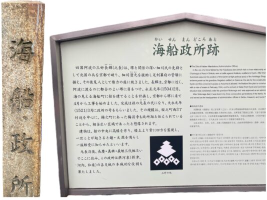 本拠地が阿波にある三好氏は、堺に拠点を置き、船で阿波と行き来をしていました。戦国堺の街の北辺に接してその拠点だった海船政所の碑が建てられています。