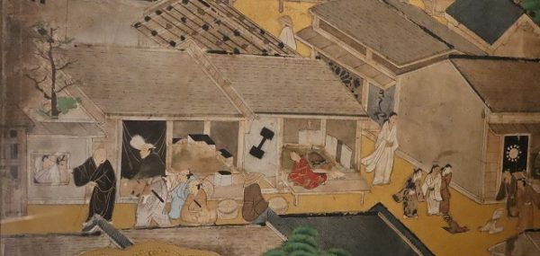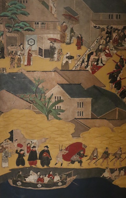 こちらは堺の街中の商店街の様子です。左側の店は黒い表紙の書物を並べています。戦国期から桃山期にかけて堺本といわれる出版が堺で盛んになったといわれています。堺の豪商たちがお金をだして木版を作り印刷したとのこと。論語や医学書など世のため人のためにひと肌ぬいだ篤志家がいたのです。三叉路を曲がったところには「きくや」というのれんも見えますが、そこから出てきたのでしょうか、真っ白な小袖を着た女性が長い布を持っていますので、布を扱っている店かもしれません。それにしても屏風に描かれている女性たちの小袖は長くゆったりとして細い帯で止めています。この当時すそが長い小袖は裕福な身分のあかしだそうですから、富豪のおかみさんたちが祭り見物にくりだしていたのでしょうか。