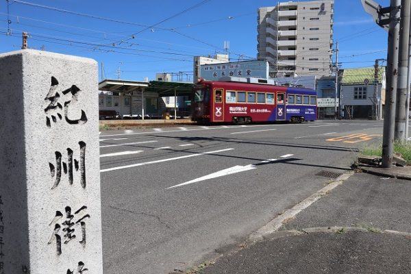 紀州街道は、江戸時代、大坂の高麗橋から和歌山城下の京橋を結び大阪湾沿岸を通る17里4町(約67㎞)の街道です。江戸中期より紀州徳川家の参勤交代の道として整備されたと言われています。もちろんそれ以前から多くの人や荷物が行き交う街道で、堺の街を南北に貫く主要道路であったので堺の街の中では大道と呼ばれていました。前回このブログで触れた住吉祭もこの街道を住吉大社から堺の宿院まで練り歩いたのです。大道には明治44年から阪堺電車(通称チン電)が走り続けています。