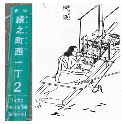 「綾」の文字は模様が織り込まれた薄絹を表します。応仁の乱(1467~77)の時、京の織手が乱を避けて堺に避難しました。彼ら・彼女らが住んだのが綾之町周辺だったのです。(綾之町の南側は錦之町)堺で彼らは単に避難していただけでなく、新たに中国(明)から堺に伝えられた技術を習得し、京に帰ってから西陣織を生みだしたと言われています。