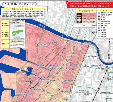 強烈な台風が堺の西側を大潮の際に通過すると堺区の半分は3m以上の浸水に襲われると想定されている