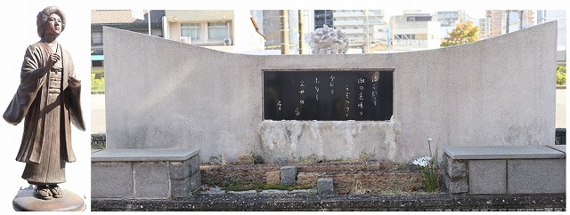 与謝野晶子の生家跡の歌碑と南海本線堺駅西口駅前広場に立つ晶子像
