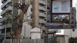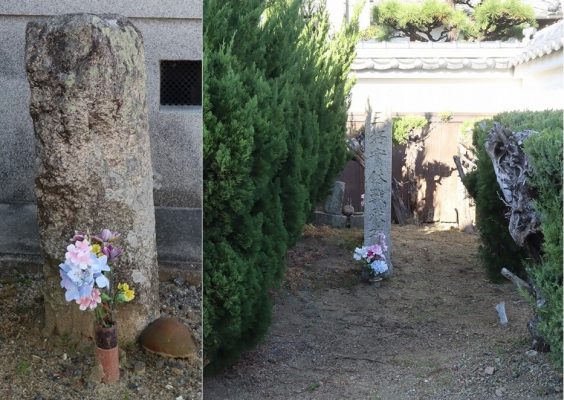 岸和田市の久米田池の近くにある三好実休の戦没碑と実休を射殺したと言われる根来衆往来左京の碑 皮肉にも道を挟んで向かい合っている