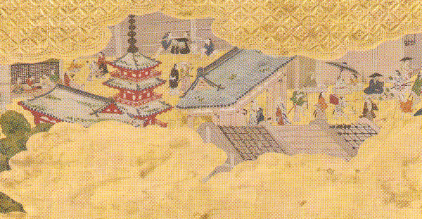 サンフランシスコ・アジア美術館蔵「住吉祭礼図屏風」の一部 三重の塔がある開口神社が描かれている。塔の左奥で会食をしているのは会合衆か?大坂夏の陣以前の堺の様子を描いたものか?