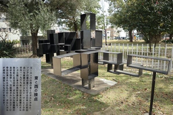 ザビエルの名を冠するのは、1551年堺に上陸したフランシスコ・ザビエルがこの地にあった日比屋了慶の家で宿泊したと言われているからです。(諸説あり)ザビエルが長旅の休息をとったおかげで公園には、「東と西の接点」というオブジェも