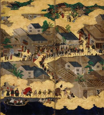 住𠮷祭礼図屏風 堺博物館 4カ所の3階建てが見える