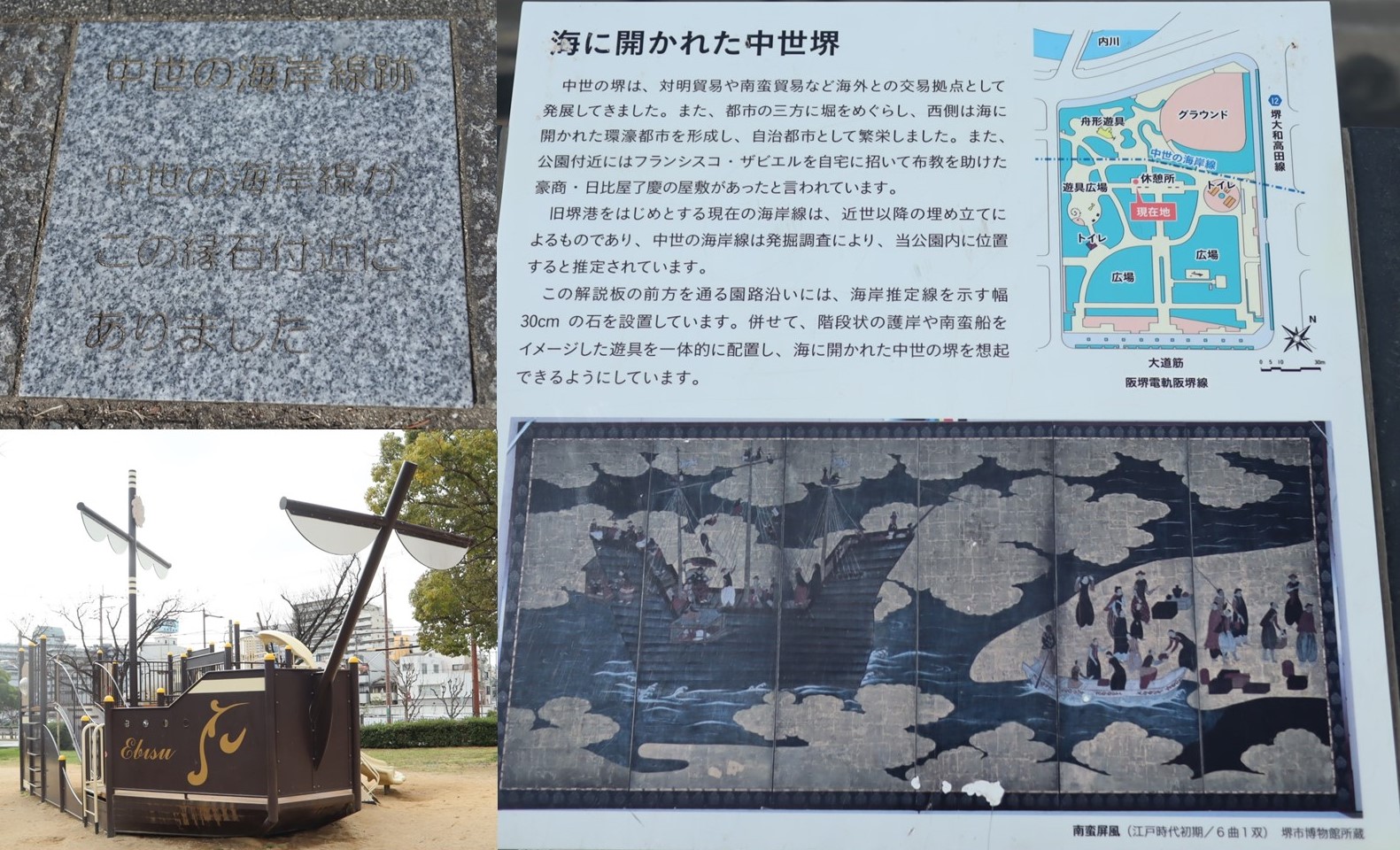 置かれています。とにかくこの公園はやたらとたくさんの記念碑があります。大きく黒く目立つ「鐵砲之碑」、小さな今はない寺院の「慈眼院之跡」、屏風をもとにした「住吉祭礼図屏風」は左右対の碑になっています。新しいところでは、旧堺中学(現三国ヶ丘高校)出身の安西冬衛の詩碑があります。この公園は、環濠内にある宿命上中世からの堺の歴史を背負っているのでしょう。